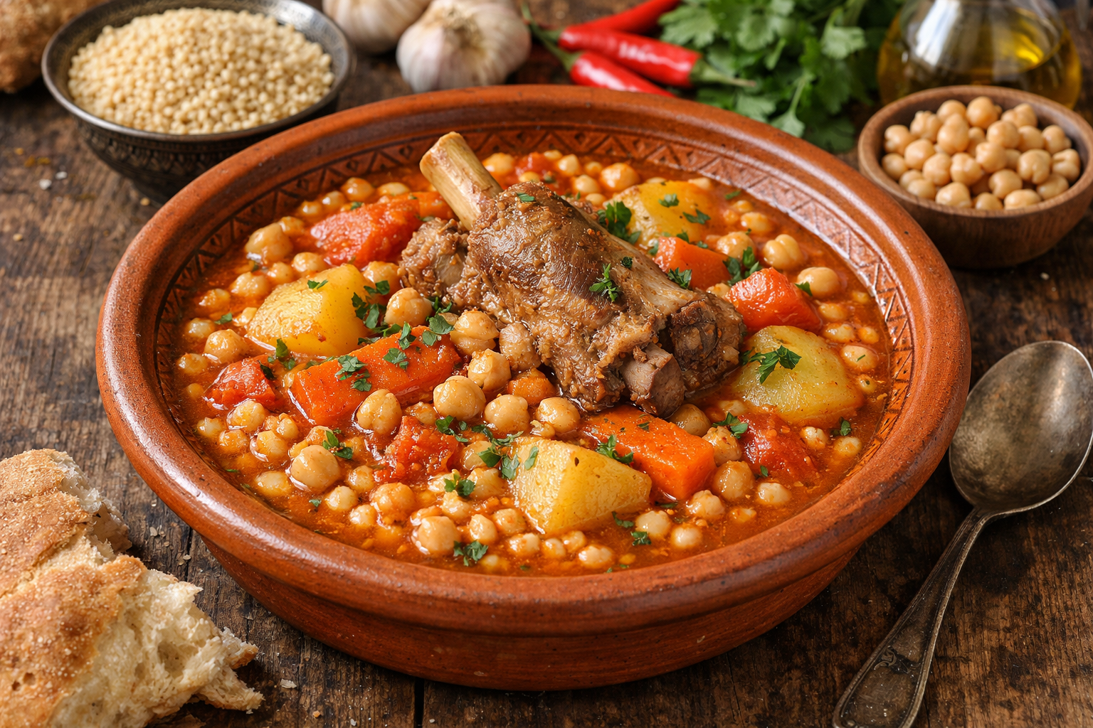 Les épices jouent un rôle crucial dans ce plat, avec des mélanges subtils de coriandre, de curcuma, de paprika et de cumin, qui éveillent les sens et promettent un voyage culinaire sans précédent. Le mariage des légumes de saison tels que les carottes, les courgettes, et les pois chiches, apporte une richesse nutritionnelle et gustative, célébrant la générosité de la terre maghrébine.